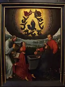 - Diptyque de Jean Ducellier, présent sur le panneau de droite, avec saint Jean, saint Georges et saint Jean ; sur le panneau gauche, de nombreuses saintes avec la Vierge