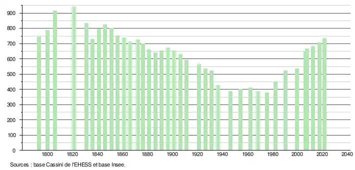 L'évolution du nombre d'habitants est connue à travers les recensements de la population effectués dans la commune depuis 1793. Pour les communes de moins de 10 000 habitants, une enquête de recensement portant sur toute la population est réalisée tous les cinq ans, les populations légales des années intermédiaires étant quant à elles estimées par interpolation ou extrapolation[15]. Pour la commune, le premier recensement exhaustif entrant dans le cadre du nouveau dispositif a été réalisé en 2007[16].