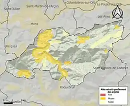 Le retrait-gonflement des sols argileux est susceptible d'engendrer des dommages importants aux bâtiments en cas d’alternance de périodes de sécheresse et de pluie. 17 % de la superficie communale est en aléa moyen ou fort (59,3 % au niveau départemental et 48,5 % au niveau national). Sur les 294 bâtiments dénombrés sur la commune en 2019, 156 sont en aléa moyen ou fort, soit 53 %, à comparer aux 85 % au niveau départemental et 54 % au niveau national. Une cartographie de l'exposition du territoire national au retrait gonflement des sols argileux est disponible sur le site du BRGM[21],[Carte 2].