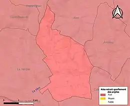 La commune est vulnérable au risque de mouvements de terrains constitué principalement du retrait-gonflement des sols argileux[24]. Cet aléa est susceptible d'engendrer des dommages importants aux bâtiments en cas d’alternance de périodes de sécheresse et de pluie. La totalité de la commune est en aléa moyen ou fort (76,3 % au niveau départemental et 48,5 % au niveau national). Sur les 128 bâtiments dénombrés sur la commune en 2019, 128 sont en aléa moyen ou fort, soit 100 %, à comparer aux 90 % au niveau départemental et 54 % au niveau national. Une cartographie de l'exposition du territoire national au retrait gonflement des sols argileux est disponible sur le site du BRGM[25],[Carte 3].