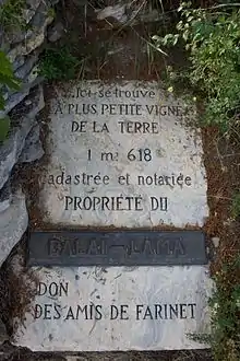 La vigne à Farinet est la plus petite vigne cadastrée du monde, nommée d'après Joseph-Samuel Farinet (1845-1880), contrebandier et faux-monnayeur des États de Savoie, parfois appelé le Robin des Bois suisse[1]. Située à Saillon, dans le canton du Valais, en Suisse, ses 3 ceps produisent quelques décilitres de moût, qu’on assemble à une bonne cuvée offerte par l’un ou l’autre propriétaire-encaveur afin de produire 1 000 bouteilles numérotées, vendues au profit d’une œuvre en faveur de l’enfance déshéritée[2]. Avec trois ceps pour une superficie de 1,618 m² (nombre d’or), la vigne à Farinet est la plus petite vigne cadastrée du monde[3],[4],[5].