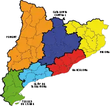 La Catalogne est divisée en huit divisions territoriales, appelées vigueries (vegueries en catalan). Les vigueries sont subdivisées en comarques et en communes, à l'exception d'Aran, considérée comme une "entité territoriale unique"[1].