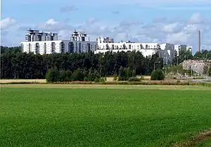 Immeubles d'habitation à Viikinmäki vus des champs de Viikki.