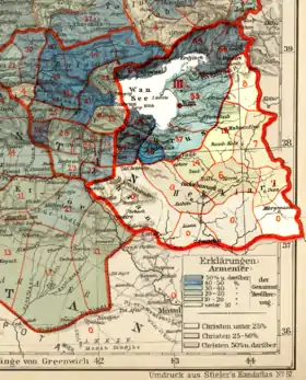 Le vilayet de Van (sandjaks de Van et Hakkari) en 1896. En bleu (nord-ouest) : population arménienne. En hachuré (sud-et) : population chrétienne assyrienne. Atlas pratique de Stieler, 1896