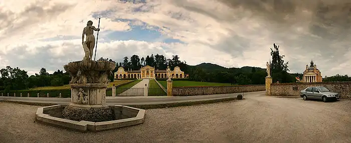 Palladio, se réclamant de l'hydraulique romaine antique, crée, à partir d'un nymphée creusé dans le bas de la colline, un système sophistiqué permettant l'approvisionnement en eau de la villa, des dépendances, des jardins et des cultures alentour[3]. Un tempietto (petit temple), un peu à l'écart, vient compléter l'ensemble.