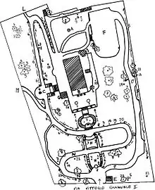 Derrière l'entrée, au pied de la pente qui mène à la villa, se dresse une façade murale monumentale concave et en mosaïque au centre. À l’intérieur de cette structure, on trouve une fontaine composée d’un bassin au milieu duquel se trouve une île rocheuse. À gauche de l'entrée du parc, une avenue bifurque et monte en formant deux virages en épingle, reliés entre eux par des volées d'escaliers. L'avenue, en gravier avec des bordures latérales en béton, se déroule en ligne droite du côté ouest et atteint l'étage de la villa par le nord. Les volées d'escaliers sont diversifiées en formes et en matériaux ; chaque niveau est relié au suivant par deux rampes identiques et symétriques par rapport à l'axe longitudinal du parc. La pelouse devant la villa est accessible par une seule rampe. Un autre accès à l'étage de la villa se trouve du côté ouest, où d'autres escaliers la relient au belvédère qui flanque l'avenue. Récemment construite, une avenue asphaltée permet l'accès des véhicules à la villa ; il bifurque à droite du portail d'entrée et longe le mur frontalier jusqu'à atteindre le parking aménagé à l'angle nord-est du parc.