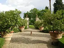 Le jardin orienté au sud est disposé dans un style italien avec des parterres de fleurs géométriques encadrés par des haies de buis, interrompues à intervalles réguliers par des agrumes. Les grands bassins et les pots en terre cuite proviennent des fours d'Impruneta; beaucoup portent marque et date.