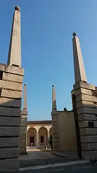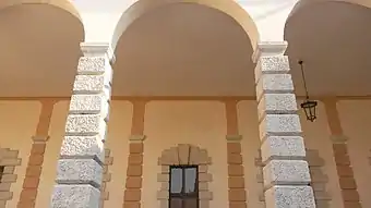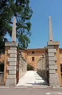Grâce au portail nord, qui reprend l’ancien motif des obélisques, on rentre dans une première cour puis dans la cour plus intérieure, autour de laquelle on retrouve les différents bâtiments. Parmi ces derniers, le plus remarquable est surement la loggia composée par six arcades qui s’appuient sur des piliers effilés en bossage rustique et qui mettent en évidence l’influence de Michele Sanmicheli (1484-1559), le plus important architecte de la ville de Vérone au XVIe siècle.