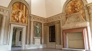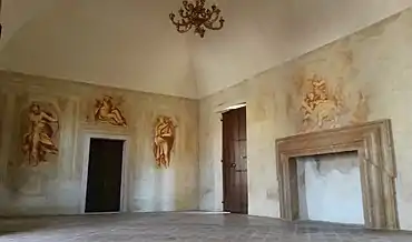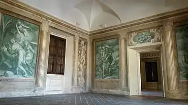 Paolo Farinati, aidé par ses fils Orazio et Giambattista, peignit les trois salons principaux de la villa autour des années 1590, en leur donnant l’aspect d’un péristyle. Sur les murs, on retrouve des colonnes surmontées par des entablements, puis des fausses statues sur des piédestaux et des scènes en monochrome ocre, vert et rouge.