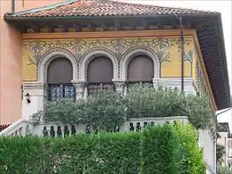 Ce puissant complexe composé de la villa et de son avant-corps en style vénéto-byzantin est orné d'une bande décorative avec fresques sous la corniche, de patères byzantins insérés ci et là dans les murs extérieurs et de la belle porte d'entrée en fer forgé. Ici, deux grands paons légèrement guingois créent avec leur roue un effet efficace de percée prospective.