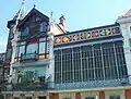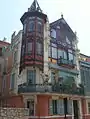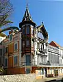 Le bâtiment est orné d'une grande véranda à vitraux polychrome et s’unit en angle avec une grande tourelle surmontée d'un clocheton[5].