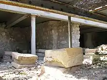 Murs des galeries 8 et 9 du côté est. Le toit en tôle protège une mosaïque.
