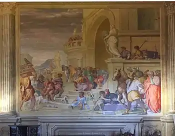 Les thèmes dominant de la première phase de construction étaient l’interprétation des Anciens romains dans un style moderne et décoratif, et cette fresque témoigne précisément de cette tendance comme l'atteste également la frise du tympan attribuée à Andrea Sansovino et la première lunette peinte par le Pontormo du mythe de Vertumne et Pomone dans le salon Léon X.