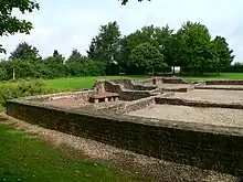 La villa s'organise à l'intérieur d'une cour carrée de 183,5 sur 185,5 mètres[1], protégée par un mur d'une épaisseur moyenne de 0,75 à 1 mètre. Les coins du mur sont à peu près alignés selon les points cardinaux. La porte d'accès d'une largeur de passage de 3,60 mètres est située au milieu du côté nord-ouest. En 1880, l'excavateur Heinrich Gieß a signalé que "deux énormes blocs de grès avec des pans de porte intégrés" [2] avaient été brisés sur le site".