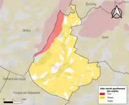 La commune est vulnérable au risque de mouvements de terrains constitué principalement du retrait-gonflement des sols argileux[15]. Cet aléa est susceptible d'engendrer des dommages importants aux bâtiments en cas d’alternance de périodes de sécheresse et de pluie. 84 % de la superficie communale est en aléa moyen ou fort (90 % au niveau départemental et 48,5 % au niveau national). Sur les 283 bâtiments dénombrés sur la commune en 2019, 220 sont en aléa moyen ou fort, soit 78 %, à comparer aux 83 % au niveau départemental et 54 % au niveau national. Une cartographie de l'exposition du territoire national au retrait gonflement des sols argileux est disponible sur le site du BRGM[16],[Carte 2].