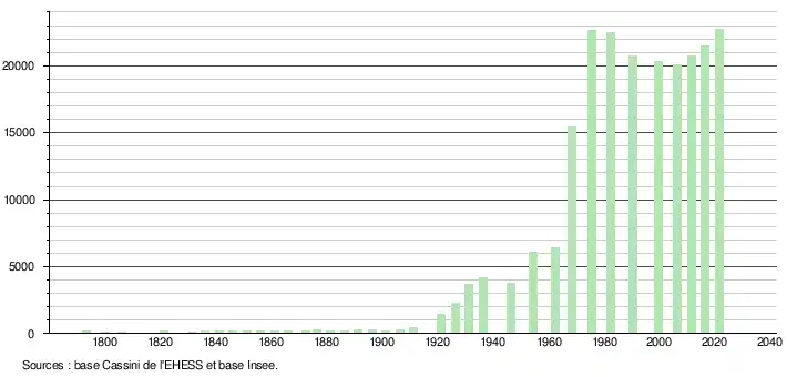 - Par convention dans Wikipédia, le principe a été retenu de n’afficher dans le tableau des recensements et le graphique, pour les populations légales postérieures à 1999, que les populations correspondant à une enquête exhaustive de recensement pour les communes de moins de 10 000 habitants, et que les populations des années 2006, 2011, 2016, etc. pour les communes de plus de 10 000 habitants, ainsi que la dernière population légale publiée par l’Insee pour l'ensemble des communes.