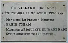 - « Village des arts de Dakar : un lieu de retraite favorable à la création », sur www.servicepublic.gouv.sn, (consulté le ) : « Sur une stèle située à l'entrée avant le grand baobab, il est noté que le village a été inauguré le 23 avril 1998 par le Premier Ministre d'alors, Habib Thiam, et le Ministre de la Culture de l'époque, Abdoulaye Elimane Kane. »
