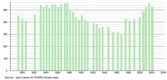 L'évolution du nombre d'habitants est connue à travers les recensements de la population effectués dans la commune depuis 1793. Pour les communes de moins de 10 000 habitants, une enquête de recensement portant sur toute la population est réalisée tous les cinq ans, les populations légales des années intermédiaires étant quant à elles estimées par interpolation ou extrapolation[20]. Pour la commune, le premier recensement exhaustif entrant dans le cadre du nouveau dispositif a été réalisé en 2005[21].