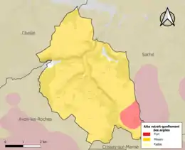 La commune est vulnérable au risque de mouvements de terrains constitué principalement du retrait-gonflement des sols argileux[23]. Cet aléa est susceptible d'engendrer des dommages importants aux bâtiments en cas d’alternance de périodes de sécheresse et de pluie. 98,4 % de la superficie communale est en aléa moyen ou fort (90,2 % au niveau départemental et 48,5 % au niveau national). Sur les 542 bâtiments dénombrés sur la commune en 2019, 542 sont en aléa moyen ou fort, soit 100 %, à comparer aux 91 % au niveau départemental et 54 % au niveau national. Une cartographie de l'exposition du territoire national au retrait gonflement des sols argileux est disponible sur le site du BRGM[24],[25].