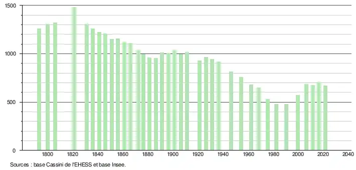 L'évolution du nombre d'habitants est connue à travers les recensements de la population effectués dans la commune depuis 1793. Pour les communes de moins de 10 000 habitants, une enquête de recensement portant sur toute la population est réalisée tous les cinq ans, les populations légales des années intermédiaires étant quant à elles estimées par interpolation ou extrapolation[17]. Pour la commune, le premier recensement exhaustif entrant dans le cadre du nouveau dispositif a été réalisé en 2006[18].