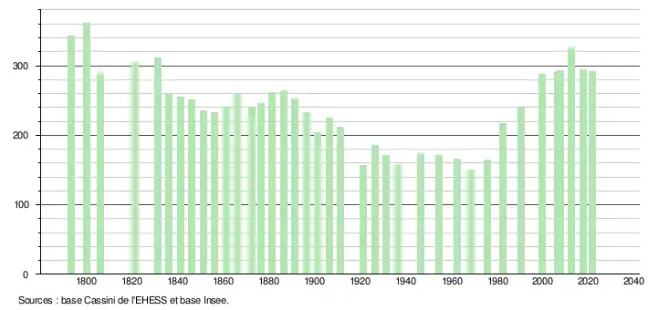 L'évolution du nombre d'habitants est connue à travers les recensements de la population effectués dans la commune depuis 1793. Pour les communes de moins de 10 000 habitants, une enquête de recensement portant sur toute la population est réalisée tous les cinq ans, les populations légales des années intermédiaires étant quant à elles estimées par interpolation ou extrapolation[25]. Pour la commune, le premier recensement exhaustif entrant dans le cadre du nouveau dispositif a été réalisé en 2007[26].