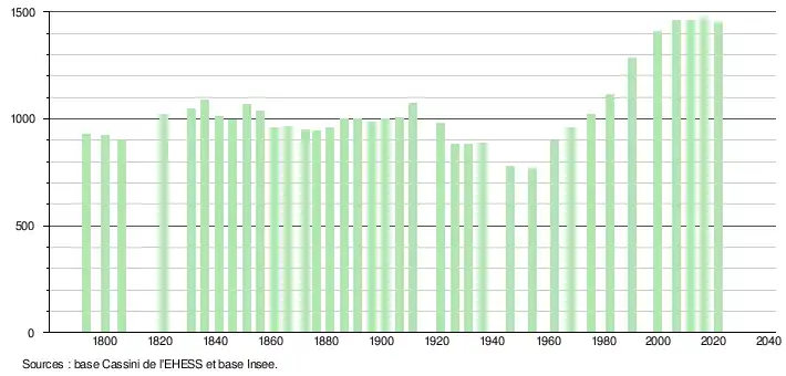 L'évolution du nombre d'habitants est connue à travers les recensements de la population effectués dans la commune depuis 1793. Pour les communes de moins de 10 000 habitants, une enquête de recensement portant sur toute la population est réalisée tous les cinq ans, les populations légales des années intermédiaires étant quant à elles estimées par interpolation ou extrapolation[21]. Pour la commune, le premier recensement exhaustif entrant dans le cadre du nouveau dispositif a été réalisé en 2006[22].