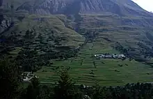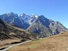 La route du col du Lautaret et le hameau des Cours ; en fond d'image, le plateau d'Emparis.