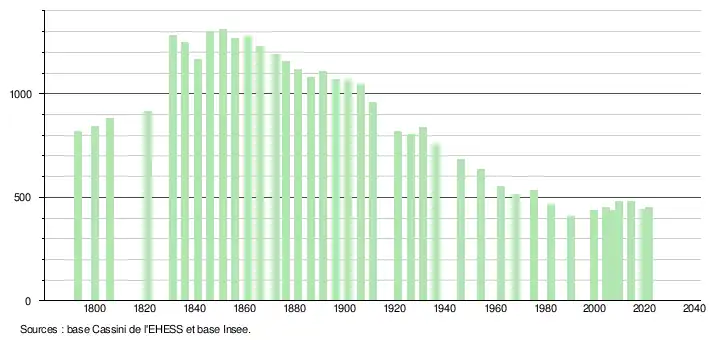 L'évolution du nombre d'habitants est connue à travers les recensements de la population effectués dans la commune depuis 1793. Pour les communes de moins de 10 000 habitants, une enquête de recensement portant sur toute la population est réalisée tous les cinq ans, les populations légales des années intermédiaires étant quant à elles estimées par interpolation ou extrapolation[20]. Pour la commune, le premier recensement exhaustif entrant dans le cadre du nouveau dispositif a été réalisé en 2004[21].