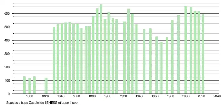 L'évolution du nombre d'habitants est connue à travers les recensements de la population effectués dans la commune depuis 1793. Pour les communes de moins de 10 000 habitants, une enquête de recensement portant sur toute la population est réalisée tous les cinq ans, les populations légales des années intermédiaires étant quant à elles estimées par interpolation ou extrapolation[19]. Pour la commune, le premier recensement exhaustif entrant dans le cadre du nouveau dispositif a été réalisé en 2006[20].