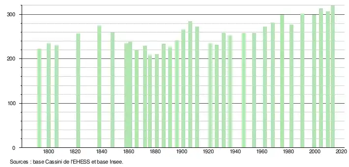 L'évolution du nombre d'habitants est connue à travers les recensements de la population effectués dans la commune depuis 1793. À partir du , les populations légales des communes sont publiées annuellement dans le cadre d'un recensement qui repose désormais sur une collecte d'information annuelle, concernant successivement tous les territoires communaux au cours d'une période de cinq ans. Pour les communes de moins de 10 000 habitants, une enquête de recensement portant sur toute la population est réalisée tous les cinq ans, les populations légales des années intermédiaires étant quant à elles estimées par interpolation ou extrapolation[4]. Pour la commune, le premier recensement exhaustif entrant dans le cadre du nouveau dispositif a été réalisé en 2004[5],[Note 1].