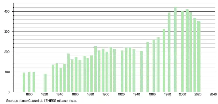 L'évolution du nombre d'habitants est connue à travers les recensements de la population effectués dans la commune depuis 1793. Pour les communes de moins de 10 000 habitants, une enquête de recensement portant sur toute la population est réalisée tous les cinq ans, les populations légales des années intermédiaires étant quant à elles estimées par interpolation ou extrapolation[16]. Pour la commune, le premier recensement exhaustif entrant dans le cadre du nouveau dispositif a été réalisé en 2005[17].