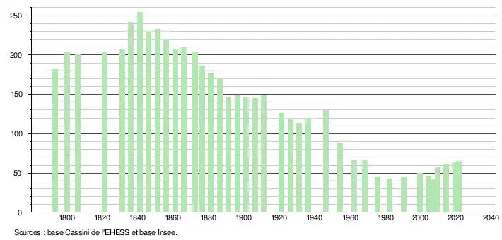 L'évolution du nombre d'habitants est connue à travers les recensements de la population effectués dans la commune depuis 1793. Pour les communes de moins de 10 000 habitants, une enquête de recensement portant sur toute la population est réalisée tous les cinq ans, les populations légales des années intermédiaires étant quant à elles estimées par interpolation ou extrapolation[20]. Pour la commune, le premier recensement exhaustif entrant dans le cadre du nouveau dispositif a été réalisé en 2004[21].