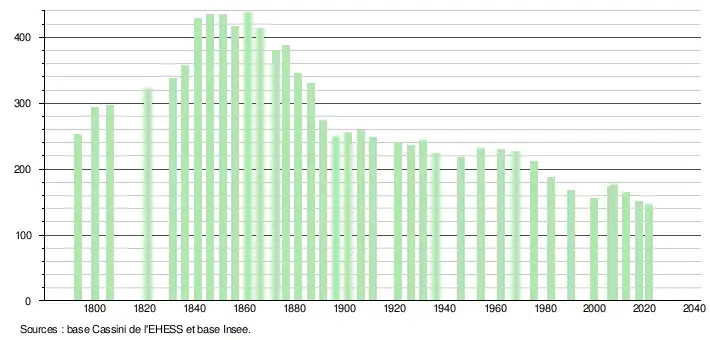 L'évolution du nombre d'habitants est connue à travers les recensements de la population effectués dans la commune depuis 1793. Pour les communes de moins de 10 000 habitants, une enquête de recensement portant sur toute la population est réalisée tous les cinq ans, les populations légales des années intermédiaires étant quant à elles estimées par interpolation ou extrapolation[14]. Pour la commune, le premier recensement exhaustif entrant dans le cadre du nouveau dispositif a été réalisé en 2007[15].