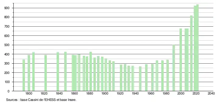 Ses habitants sont appelés les Villageoises et les Villageois[20]. L'évolution du nombre d'habitants est connue à travers les recensements de la population effectués dans la commune depuis 1793. Pour les communes de moins de 10 000 habitants, une enquête de recensement portant sur toute la population est réalisée tous les cinq ans, les populations légales des années intermédiaires étant quant à elles estimées par interpolation ou extrapolation[21]. Pour la commune, le premier recensement exhaustif entrant dans le cadre du nouveau dispositif a été réalisé en 2008[22].