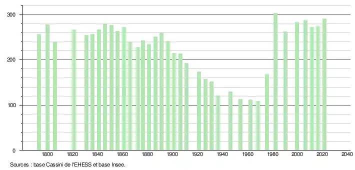 L'évolution du nombre d'habitants est connue à travers les recensements de la population effectués dans la commune depuis 1793. Pour les communes de moins de 10 000 habitants, une enquête de recensement portant sur toute la population est réalisée tous les cinq ans, les populations légales des années intermédiaires étant quant à elles estimées par interpolation ou extrapolation[19]. Pour la commune, le premier recensement exhaustif entrant dans le cadre du nouveau dispositif a été réalisé en 2006[20].