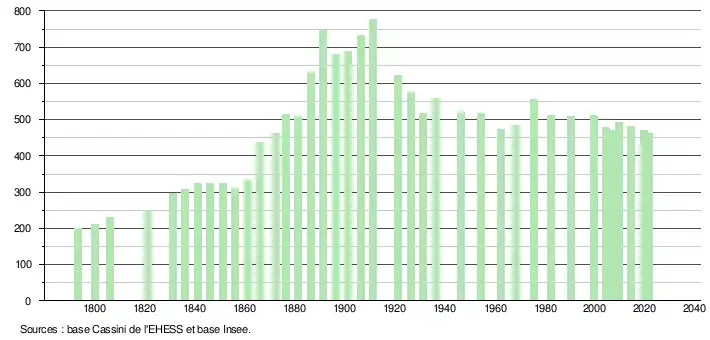 L'évolution du nombre d'habitants est connue à travers les recensements de la population effectués dans la commune depuis 1793. Pour les communes de moins de 10 000 habitants, une enquête de recensement portant sur toute la population est réalisée tous les cinq ans, les populations légales des années intermédiaires étant quant à elles estimées par interpolation ou extrapolation[21]. Pour la commune, le premier recensement exhaustif entrant dans le cadre du nouveau dispositif a été réalisé en 2004[22].