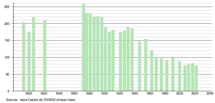L'évolution du nombre d'habitants est connue à travers les recensements de la population effectués dans la commune depuis 1793. Pour les communes de moins de 10 000 habitants, une enquête de recensement portant sur toute la population est réalisée tous les cinq ans, les populations légales des années intermédiaires étant quant à elles estimées par interpolation ou extrapolation[18]. Pour la commune, le premier recensement exhaustif entrant dans le cadre du nouveau dispositif a été réalisé en 2006[19].