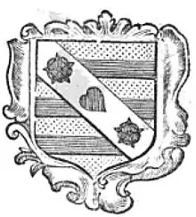 Blason | D'or à trois fasces d'azur à la bande d'argent chargée d'un cœur de gueules entre deux roses de même. |