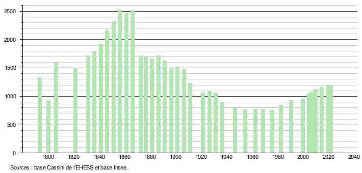 L'évolution du nombre d'habitants est connue à travers les recensements de la population effectués dans la commune depuis 1793. Pour les communes de moins de 10 000 habitants, une enquête de recensement portant sur toute la population est réalisée tous les cinq ans, les populations légales des années intermédiaires étant quant à elles estimées par interpolation ou extrapolation[16]. Pour la commune, le premier recensement exhaustif entrant dans le cadre du nouveau dispositif a été réalisé en 2004[17].