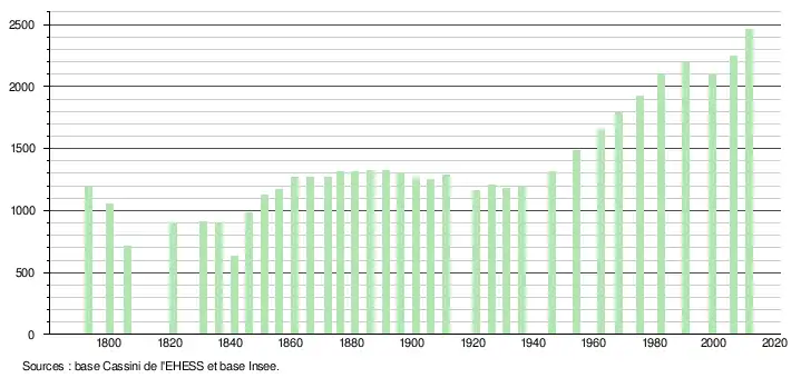L'évolution du nombre d'habitants est connue à travers les recensements de la population effectués dans la commune depuis 1793. À partir du , les populations légales des communes sont publiées annuellement dans le cadre d'un recensement qui repose désormais sur une collecte d'information annuelle, concernant successivement tous les territoires communaux au cours d'une période de cinq ans. Pour les communes de moins de 10 000 habitants, une enquête de recensement portant sur toute la population est réalisée tous les cinq ans, les populations légales des années intermédiaires étant quant à elles estimées par interpolation ou extrapolation[19]. Pour la commune, le premier recensement exhaustif entrant dans le cadre du nouveau dispositif a été réalisé en 2007[20],[Note 1].