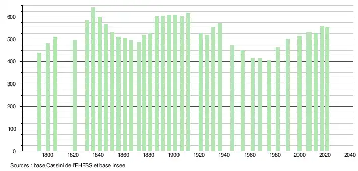L'évolution du nombre d'habitants est connue à travers les recensements de la population effectués dans la commune depuis 1793. Pour les communes de moins de 10 000 habitants, une enquête de recensement portant sur toute la population est réalisée tous les cinq ans, les populations légales des années intermédiaires étant quant à elles estimées par interpolation ou extrapolation[12]. Pour la commune, le premier recensement exhaustif entrant dans le cadre du nouveau dispositif a été réalisé en 2007[13].