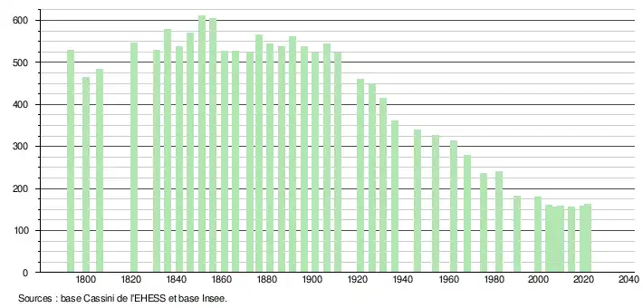 L'évolution du nombre d'habitants est connue à travers les recensements de la population effectués dans la commune depuis 1793. Pour les communes de moins de 10 000 habitants, une enquête de recensement portant sur toute la population est réalisée tous les cinq ans, les populations légales des années intermédiaires étant quant à elles estimées par interpolation ou extrapolation[28]. Pour la commune, le premier recensement exhaustif entrant dans le cadre du nouveau dispositif a été réalisé en 2004[29].