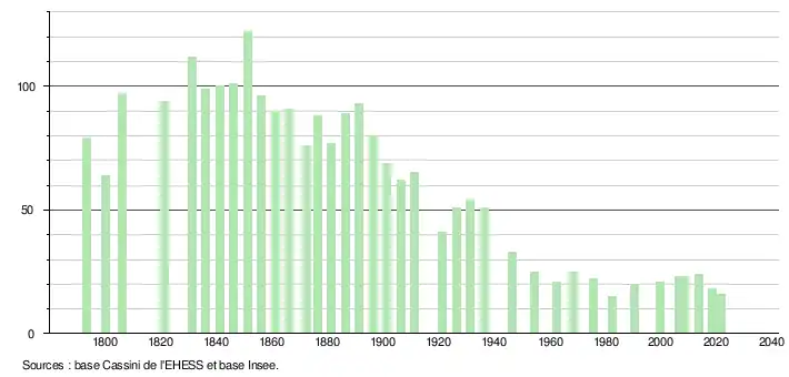 L'évolution du nombre d'habitants est connue à travers les recensements de la population effectués dans la commune depuis 1793. Pour les communes de moins de 10 000 habitants, une enquête de recensement portant sur toute la population est réalisée tous les cinq ans, les populations légales des années intermédiaires étant quant à elles estimées par interpolation ou extrapolation[23]. Pour la commune, le premier recensement exhaustif entrant dans le cadre du nouveau dispositif a été réalisé en 2008[24].