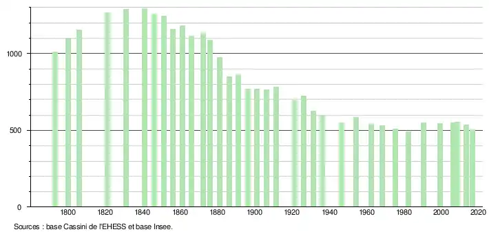 L'évolution du nombre d'habitants est connue à travers les recensements de la population effectués dans la commune depuis 1793. Pour les communes de moins de 10 000 habitants, une enquête de recensement portant sur toute la population est réalisée tous les cinq ans, les populations légales des années intermédiaires étant quant à elles estimées par interpolation ou extrapolation[18]. Pour la commune, le premier recensement exhaustif entrant dans le cadre du nouveau dispositif a été réalisé en 2008[19].