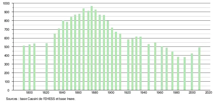 L'évolution du nombre d'habitants est connue à travers les recensements de la population effectués dans la commune depuis 1793. À partir du , les populations légales des communes sont publiées annuellement dans le cadre d'un recensement qui repose désormais sur une collecte d'information annuelle, concernant successivement tous les territoires communaux au cours d'une période de cinq ans. Pour les communes de moins de 10 000 habitants, une enquête de recensement portant sur toute la population est réalisée tous les cinq ans, les populations légales des années intermédiaires étant quant à elles estimées par interpolation ou extrapolation[8]. Pour la commune, le premier recensement exhaustif entrant dans le cadre du nouveau dispositif a été réalisé en 2008[9],[Note 1].