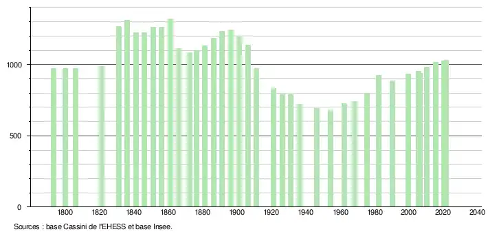 L'évolution du nombre d'habitants est connue à travers les recensements de la population effectués dans la commune depuis 1793. Pour les communes de moins de 10 000 habitants, une enquête de recensement portant sur toute la population est réalisée tous les cinq ans, les populations légales des années intermédiaires étant quant à elles estimées par interpolation ou extrapolation[17]. Pour la commune, le premier recensement exhaustif entrant dans le cadre du nouveau dispositif a été réalisé en 2005[18].
