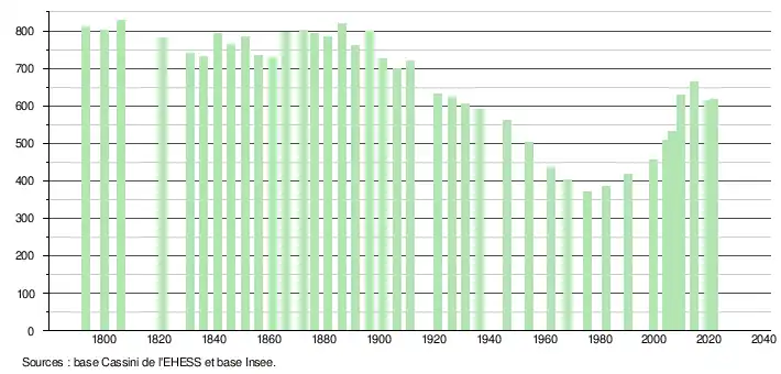 L'évolution du nombre d'habitants est connue à travers les recensements de la population effectués dans la commune depuis 1793. Pour les communes de moins de 10 000 habitants, une enquête de recensement portant sur toute la population est réalisée tous les cinq ans, les populations légales des années intermédiaires étant quant à elles estimées par interpolation ou extrapolation[17]. Pour la commune, le premier recensement exhaustif entrant dans le cadre du nouveau dispositif a été réalisé en 2004[18].