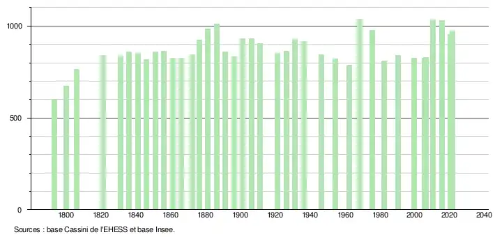 L'évolution du nombre d'habitants est connue à travers les recensements de la population effectués dans la commune depuis 1793. Pour les communes de moins de 10 000 habitants, une enquête de recensement portant sur toute la population est réalisée tous les cinq ans, les populations légales des années intermédiaires étant quant à elles estimées par interpolation ou extrapolation[34]. Pour la commune, le premier recensement exhaustif entrant dans le cadre du nouveau dispositif a été réalisé en 2005[35].