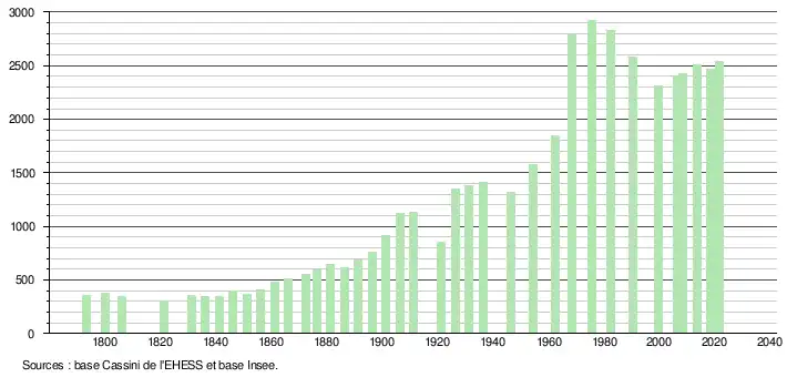 L'évolution du nombre d'habitants est connue à travers les recensements de la population effectués dans la commune depuis 1793. Pour les communes de moins de 10 000 habitants, une enquête de recensement portant sur toute la population est réalisée tous les cinq ans, les populations légales des années intermédiaires étant quant à elles estimées par interpolation ou extrapolation[34]. Pour la commune, le premier recensement exhaustif entrant dans le cadre du nouveau dispositif a été réalisé en 2008[35].