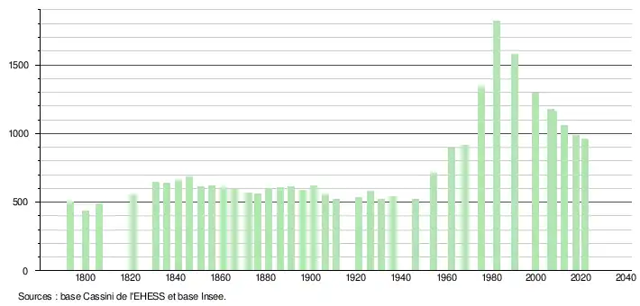 | L'évolution du nombre d'habitants est connue à travers les recensements de la population effectués dans la commune depuis 1793. Pour les communes de moins de 10 000 habitants, une enquête de recensement portant sur toute la population est réalisée tous les cinq ans, les populations légales des années intermédiaires étant quant à elles estimées par interpolation ou extrapolation[40]. Pour la commune, le premier recensement exhaustif entrant dans le cadre du nouveau dispositif a été réalisé en 2007[41]. En 2021, la commune comptait 960 habitants[Note 6], en diminution de 5,51 % par rapport à 2015 (Ariège : +1,38 %, France hors Mayotte : +1,84 %). |